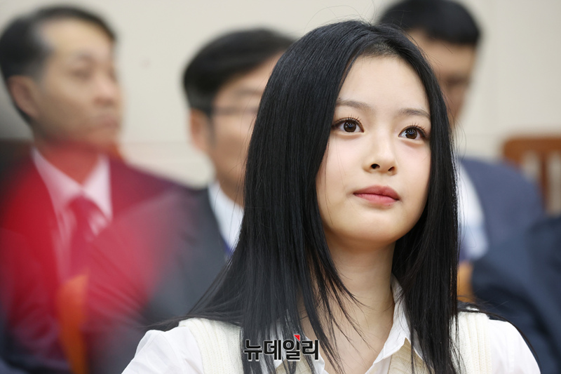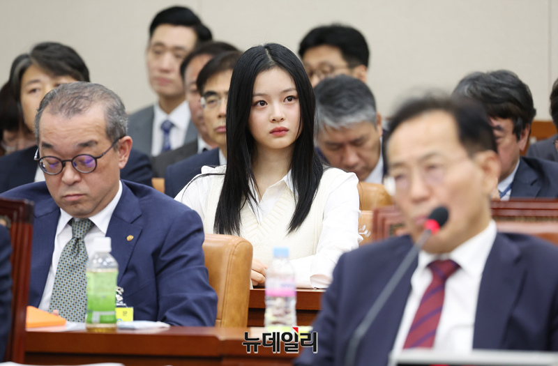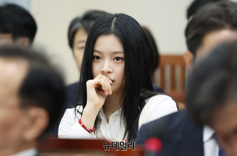 그룹 뉴진스(NewJeans) 하니가 15일 오후 국회 환경노동위원회에서 열린 국정감사에 참고인으로 출석해 앉아 있다.