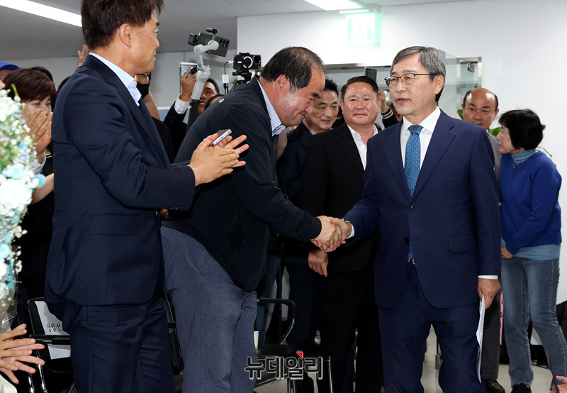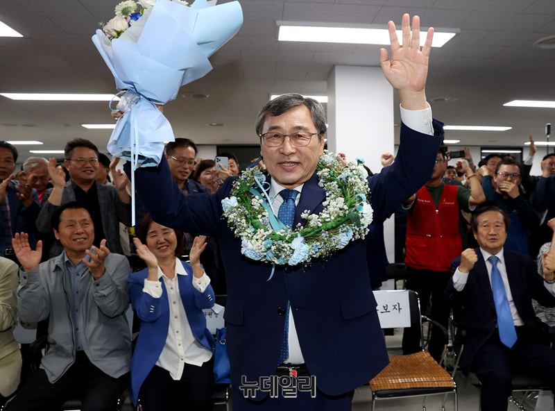 정근식 서울교육감 후보자 내외가 16일 오후 서울 마포구에 마련된 선거사무실에서 당선이 확실시 되자 손을 잡고 환호하고 있다.