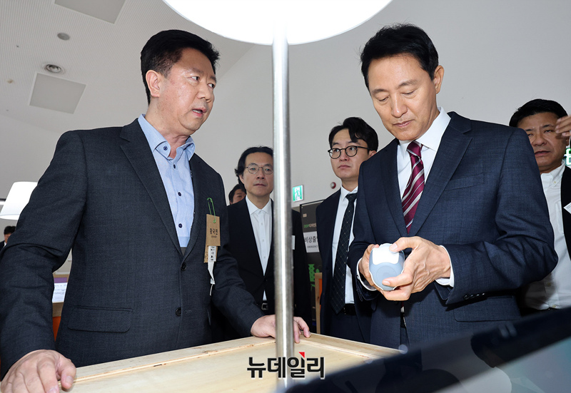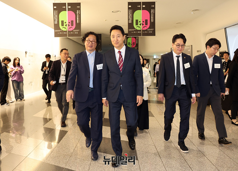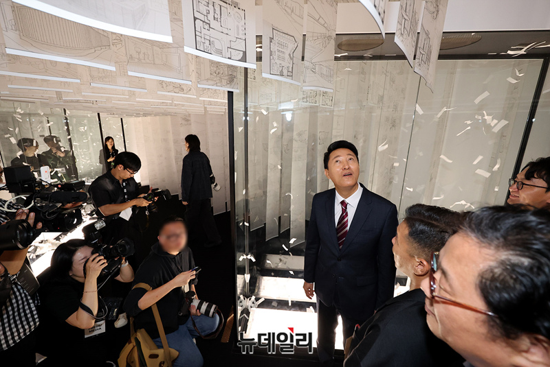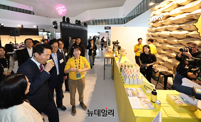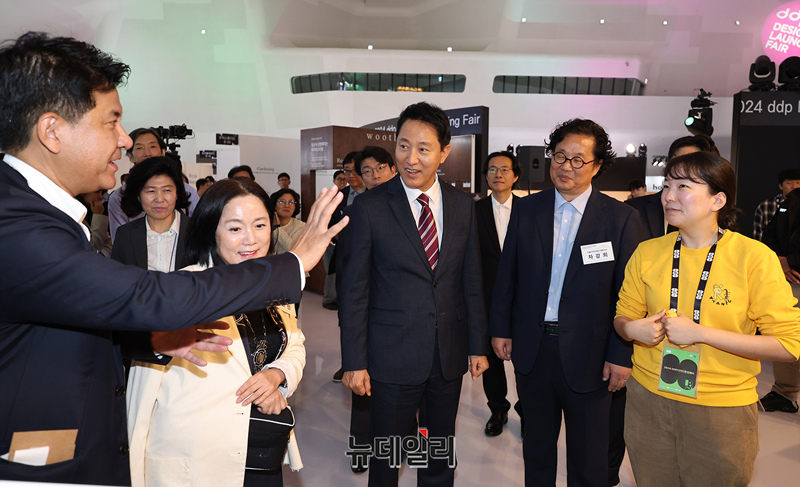 오세훈 서울시장, 차강희 서울디자인재단 대표 등 주요 참석자들이 17일 오후 서울 중구 DDP에서 열린 서울디자인 2024에서 디자인론칭페어 부스를 관람하고 있다.