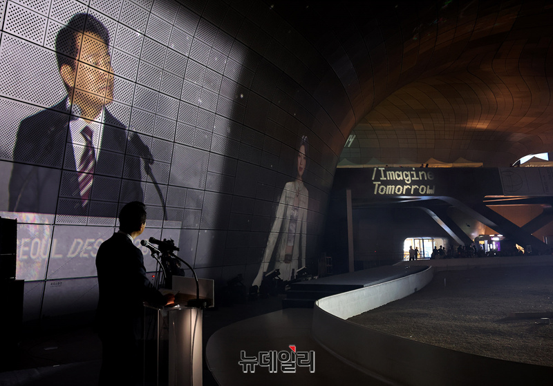 오세훈 서울시장이 17일 오후 서울 중구 동대문디자인플라자(DDP)에서 열린 '서울 디자인 2024' 개막식에서 SM소속 버추얼아이돌 ‘나이비스’ 와 대화를 하고 있다.