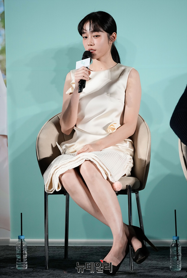 배우 노윤서가 18일 오전 서울 성동구 메가박스 성수점에서 열린 영화 '청설(조선호 감독)' 제작보고회에서 포즈를 소감을 밝히고 있다.