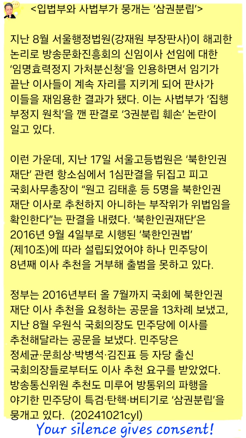 《 입법부와 사법부가 뭉개는 [삼권분립] 》지난 8월 서울행정법원(강재원 부장판사)이 해괴한 논리로 《방송문화진흥회》의 신임이사 선임에 대한 《임명효력정지 가처분신청》을 인용하면서 임기가 끝난 이사들이 계속 자리를 지키게 되어, 판사가 이들을 재임용한 결과가 됐다.이는 사법부가 《집행 부정지 원칙》을 깬 판결로 《3권분립 훼손》 논란이 일고 있다.이런 가운데, 지난 17일 서울고등법원은 《북한인권재단》 관련 항소심에서 1심판결을 뒤집고, "피고 국회사무총장이 원고 김태훈 등 5명을 북한인권재단 이사로 추천하지 아니하는 부작위가 위법임을 확인한다”는 판결을 내렸다.《북한인권재단》은 2016년 9월 4일부로 시행된 《북한인권법》(제10조)에 따라 설립되었어야 하나, 민주당이 8년째 이사 추천을 거부해 출범을 못하고 있다.정부는 2016년부터 올 7월까지 국회에 《북한인권재단》 이사 추천을 요청하는 공문을 13차례 보냈고, 지난 8월 우원식 국회의장도 민주당에 이사를 추천해달라는 공문을 보냈다.민주당은 정세균·문희상·박병석·김진표 등 자당 출신 국회의장들로부터도 이사 추천 요구를 받았었다.방송통신위원 추천도 미루어 방통위의 파행을 야기한 민주당이 특검·탄핵·버티기로 《삼권분립》을 뭉개고 있다.