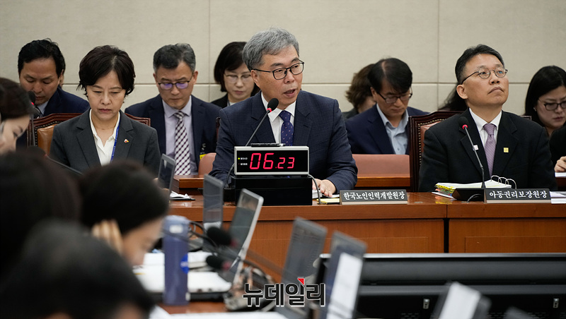 김미곤 한국노인인력개발원장이 21일 오전 서울 여의도 국회에서 열린 국회 보건복지위원회의 한국노인인력개발원 등에 대한 국정감사에서 의원들의 질의에 답하고 있다.