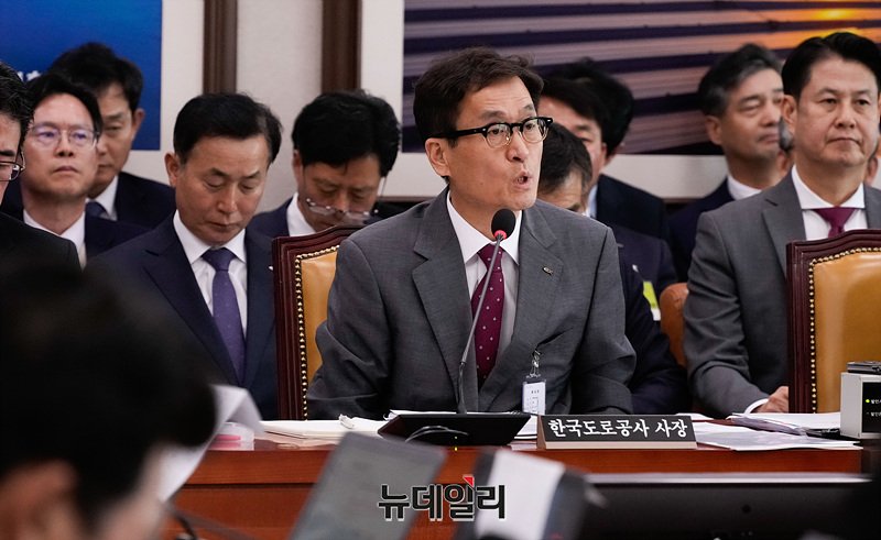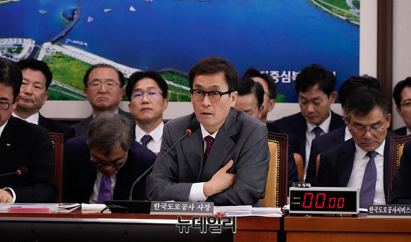 함진규 한국도로공사 사장이 21일 오전 서울 여의도 국회에서 열린 국회 국토교통위원회의 한국도로공사 등에 대한 국정감사에서 의원들의 질의에 답하고 있다.