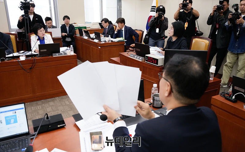 최형두 국민의힘 의원과 김현 더불어민주당 의원이 21일 오후 서울 여의도 국회에서 열린 국회 과학기술방송통신위원회의 방송통신심의위원회에 대한 국정감사에서 언쟁하고 있다.