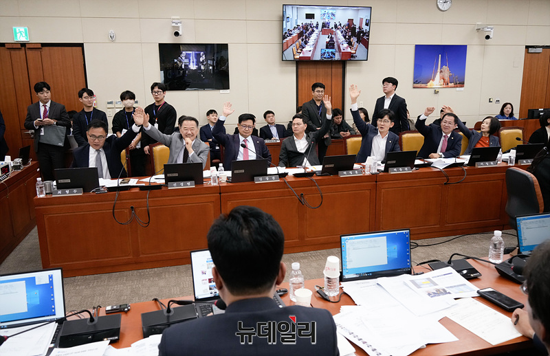 여야 의원들이 21일 오후 서울 여의도 국회에서 열린 국회 과학기술방송통신위원회의 방송통신심의위원회에 대한 국정감사에서 동행명령장 발부의 건에 대해 거수표결을 하고 있다.