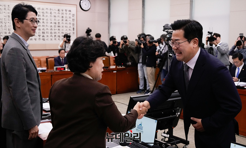 박찬대 더불어민주당 원내대표와 박성준 의원이 21일 오후 서울 여의도 국회에서 열린 국회 법제사법위원회의 대검찰청에 대한 국정감사에서 인사를 나누고 있다.