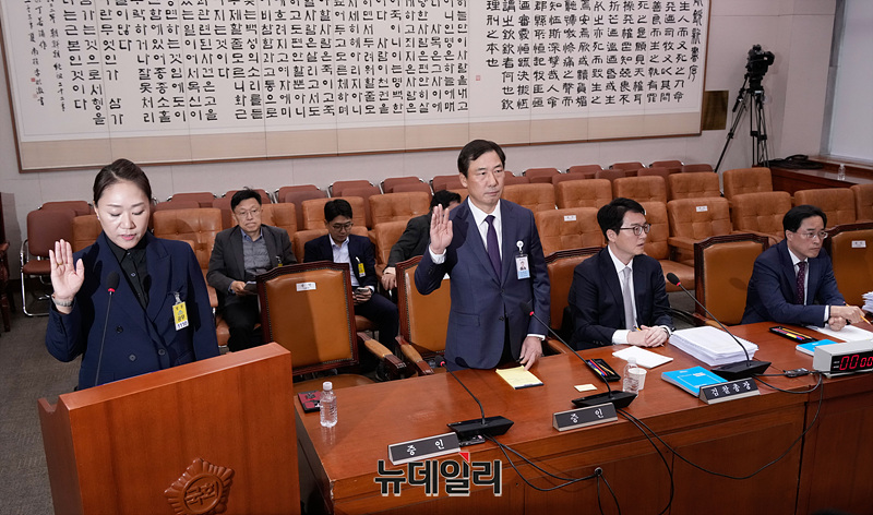 강혜경 씨가 21일 오후 서울 여의도 국회에서 열린 국회 법제사법위원회의 대검찰청에 대한 국정감사에서 증인선서를 하고 있다.