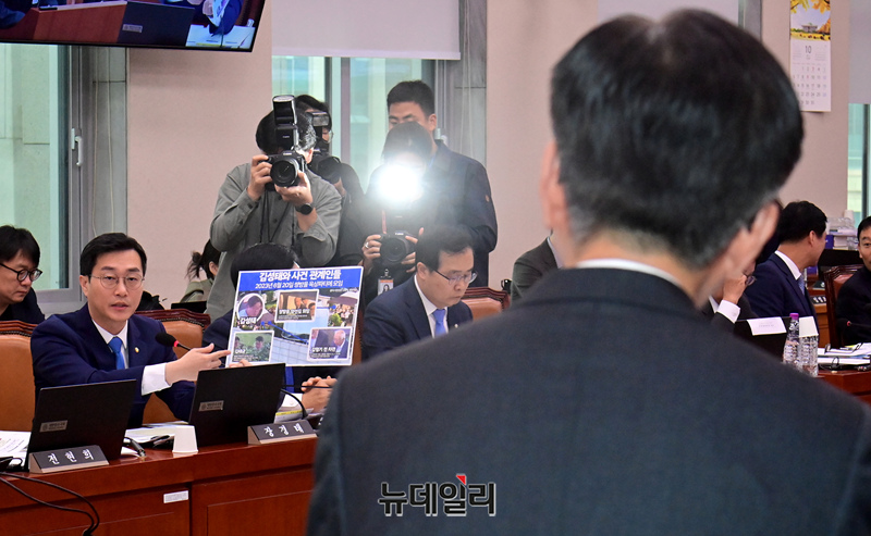 장경태 더불어민주당 의원이 22일 오전 국회에서 열린 법제사법위원회의 서울고법, 서울중앙지법, 수원지법 등에 대한 국정감사에서 '쌍방울 대북송금 사건' 재판과 관련해 김세윤 수원지방법원장에게 질의를 하고 있다.