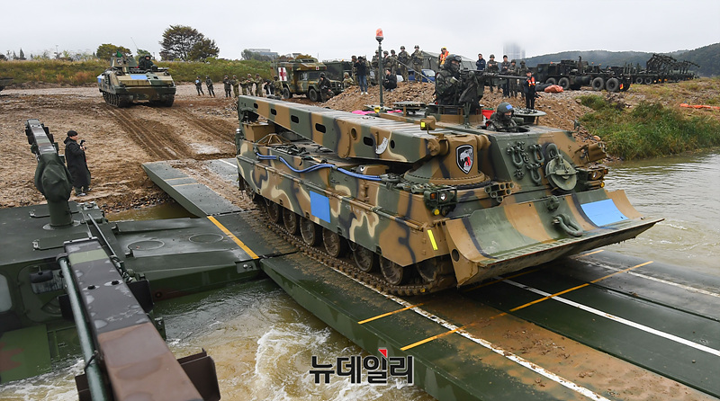 K1A2전차, K200장갑차, K21보병전투장갑차, K30 비호 등 장비들이 22일 오후 경기 여주시 남한강 일대에서 열린 한미연합 제병협동 도하훈련에서 한국형 자주도하장비 수룡(KM3)을 통해 도하하고 있다.