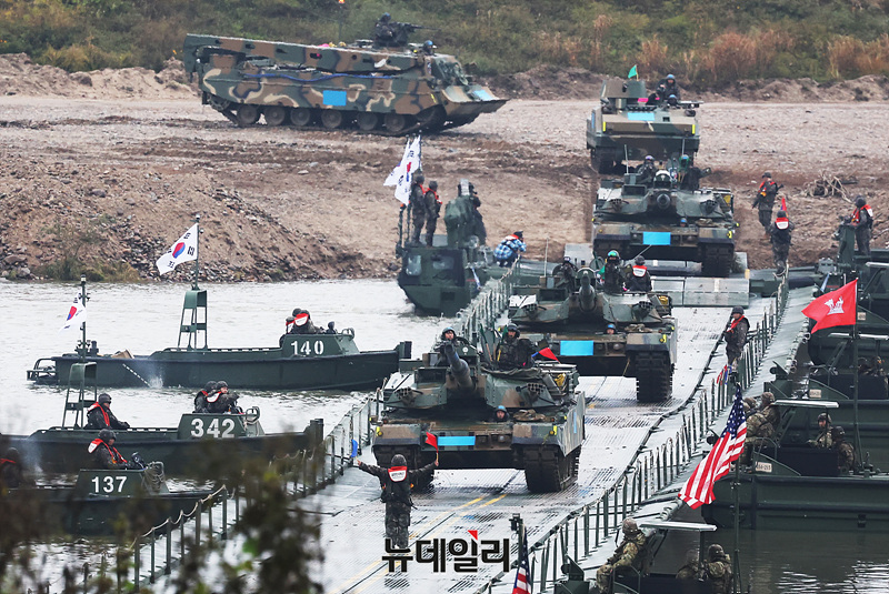 자주도하장비 '수룡'의 전략화 이후 처음으로 진행된 이번 훈련은 육군 제7기동군단 예하 7공병여단, 수도기계화보병사단, 미2사단, 한미연합사단 다목적 교량중대가 참여했다. (경기 여주=서성진 기자)