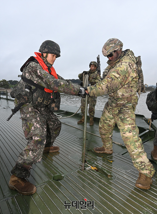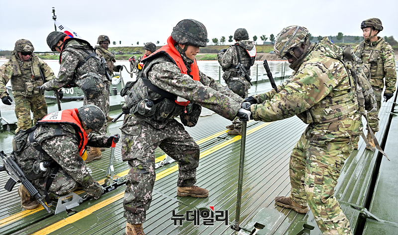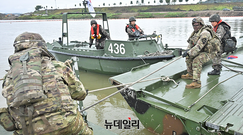 제7기동군단 소속 공병여단 장병과 미2사단(한미연합사단) 장병들이 22일 오후 경기 여주시 남한강 일대에서 열린 한미연합 제병협동 도하훈련에서 부교를 조립하고 있다.