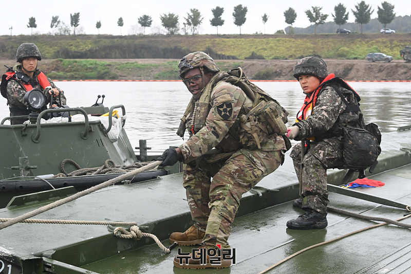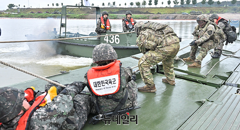 자주도하장비 '수룡'의 전략화 이후 처음으로 진행된 이번 훈련은 육군 제7기동군단 예하 7공병여단, 수도기계화보병사단, 미2사단, 한미연합사단 다목적 교량중대가 참여했다. (경기 여주=서성진 기자)