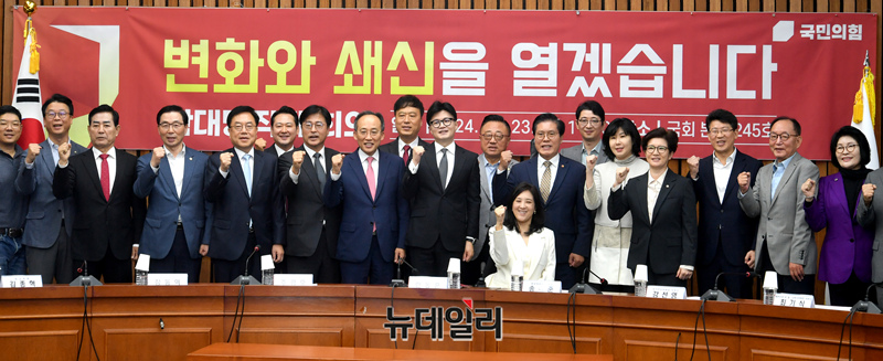 한동훈 국민의힘 대표와 추경호 원내대표 등 참석자들이 23일 오전 국회에서 열린 확대당직자회의에 앞서 기념 촬영을 하고 있다.