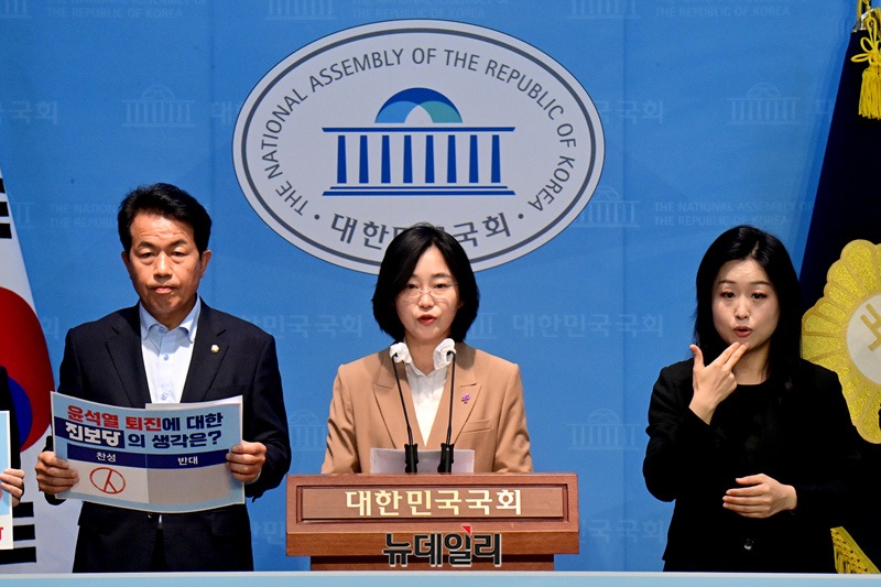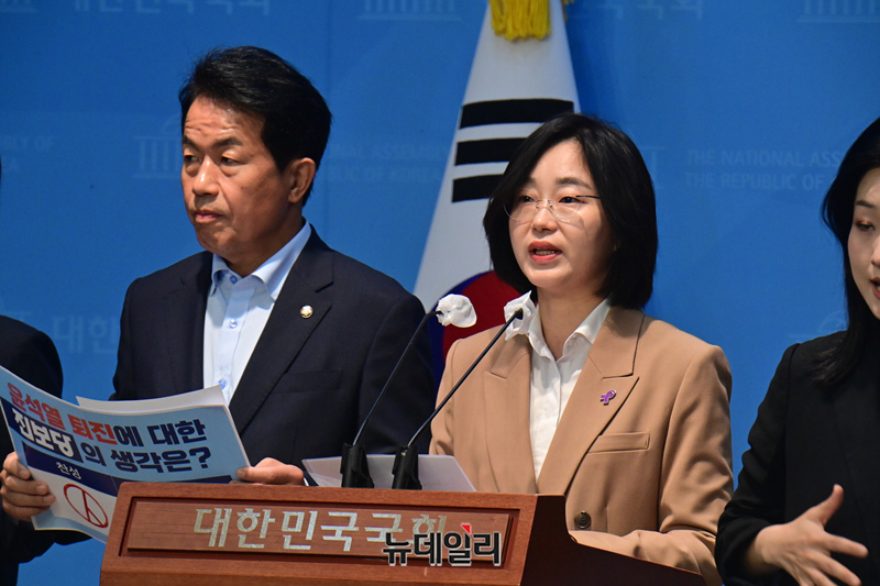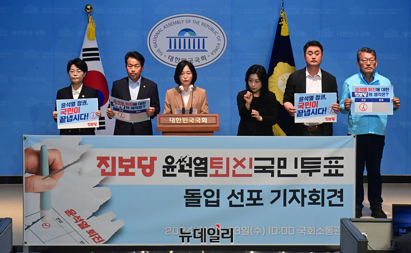 김재연 진보당 상임대표가 23일 오전 국회 소통관에서 열린 '윤석열 퇴진 국민투표' 돌입 선포 기자회견에서 발언을 하고 있다.