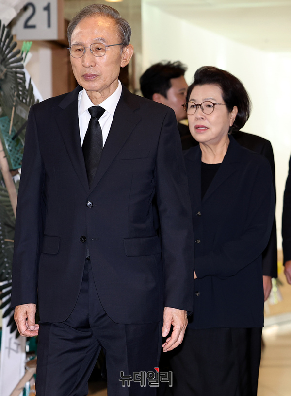 이명박 전 대통령과 부인 김윤옥 여사가 23일 오후 서울 송파구 서울아산병원 장례식장에 마련된 이상득 전 국회의원 빈소를 찾아 입장하고 있다.
