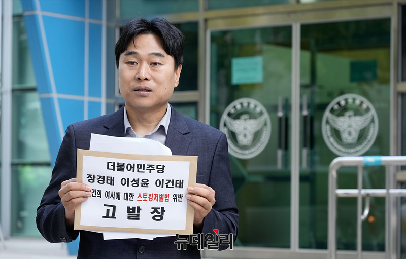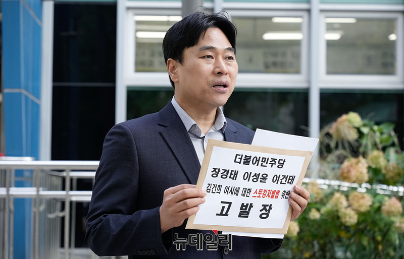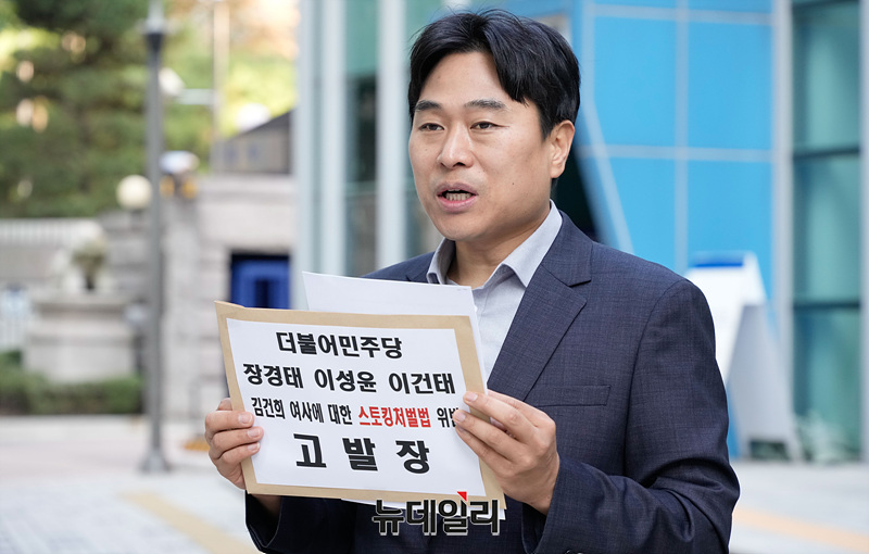 이종배 서울시의원이 24일 오전 서울 종로구 서울경찰청에서 장경태, 이성윤, 김건태 더불어민주당 의원을 '스토킹범처벌법 위반' 혐의로 고발하며 입장을 밝히고 있다.