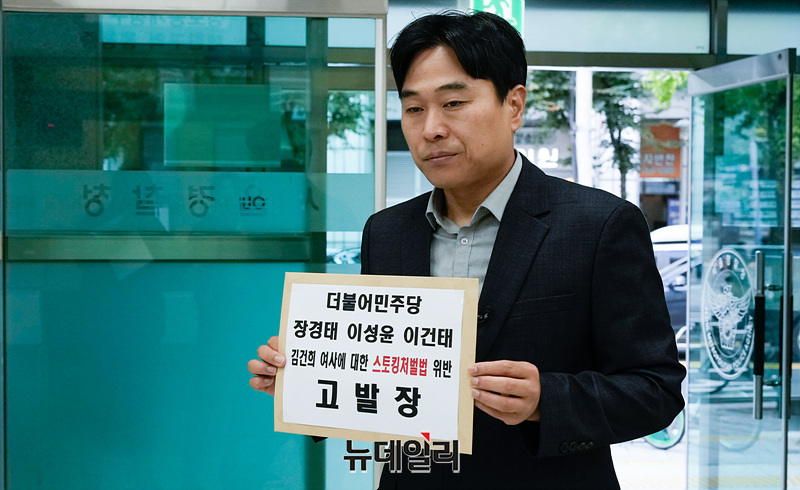 이종배 서울시의원이 24일 오전 서울 종로구 서울경찰청에서 장경태, 이성윤, 김건태 더불어민주당 의원을 '스토킹범처벌법 위반' 혐의로 고발장을 접수하고 있다.