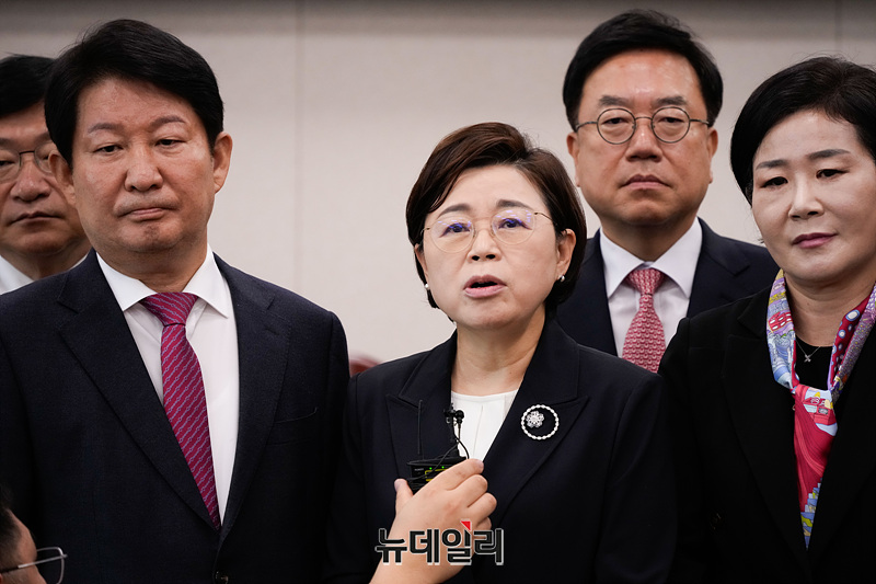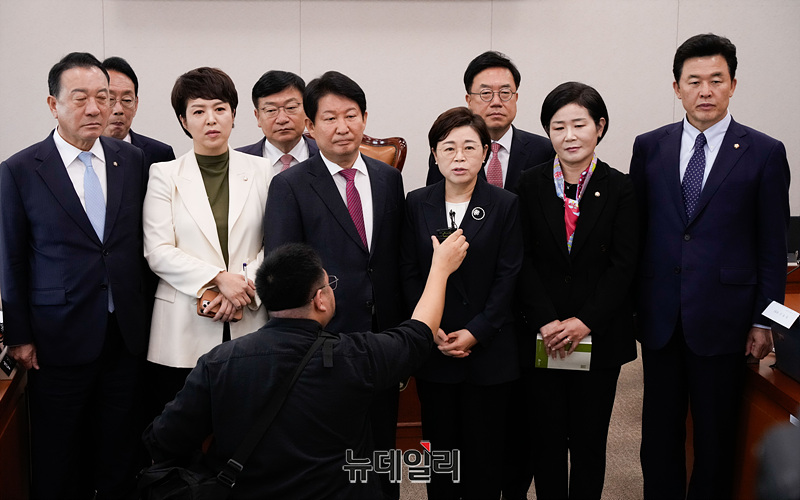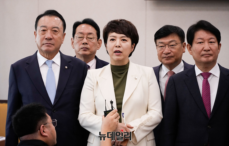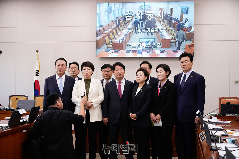 국회 국토교통위원회 소속 권영진 국민의힘 간사를 비롯한 여당 의원들이 24일 오전 서울 여의도 국회 국토위원회 회의실에서 기자회견을 하고 있다.