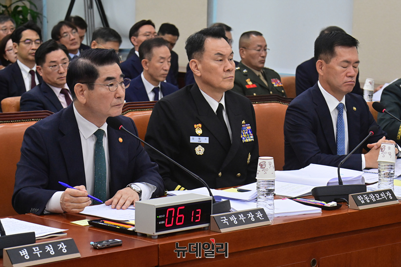 김용현 국방부 장관이 24일 오전 국회 국방위원회에서 열린 국방부 등에 대한 종합 국정감사에서 의원들의 질의에 답하고 있다.