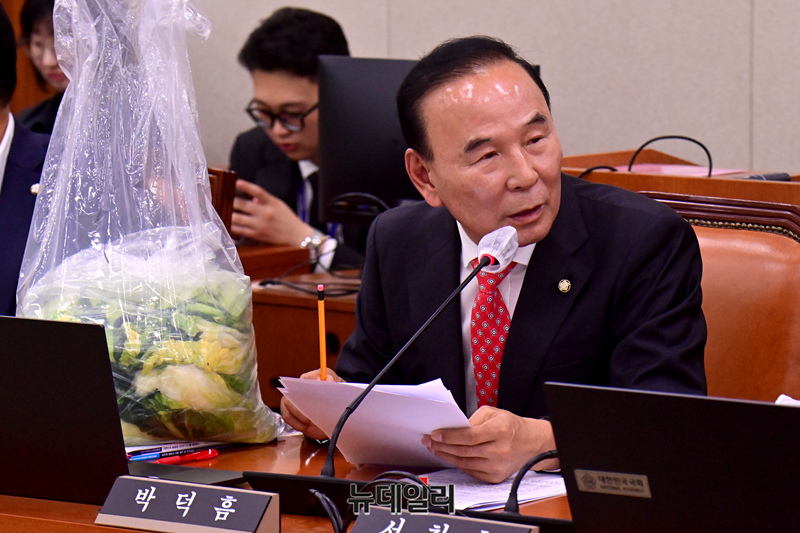박덕흠 국민의힘 의원이 24일 오전 국회 농림축산식품해양수산위원회에서 열린 농림축산식품부 및 소관기관 종합 국정감사에서 김장 재료를 들어 보이고 있다.