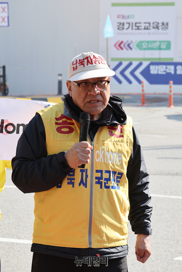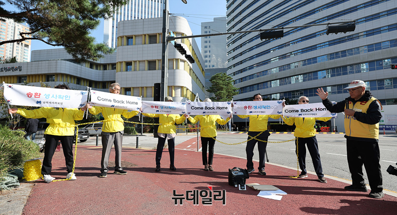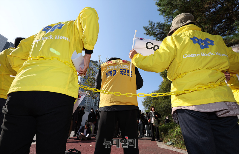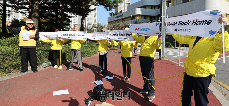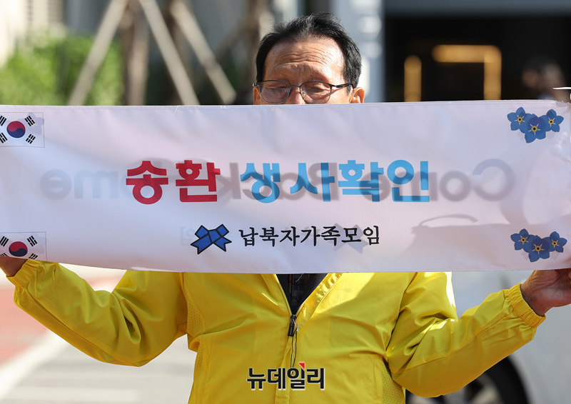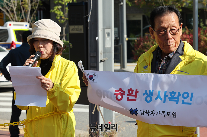 최성용 납북자가족모임 대표와 회원들이 24일 오후 경기 수원시 경기도청 후문에서 납북된 가족들의 송환과 생사확인을 요구하며 대북전단 제작과 살포 등과 관련해 기자회견을 갖고 있다. (경기 수원=정상윤 기자)