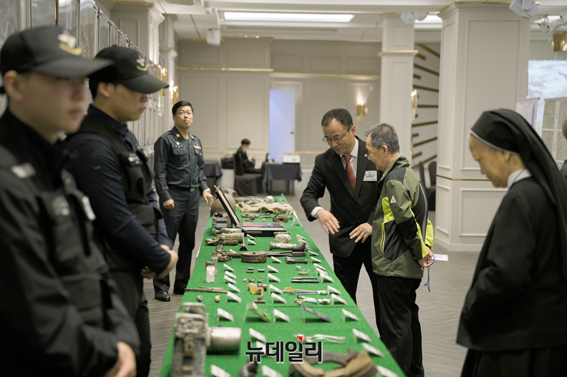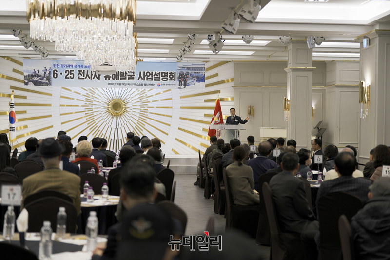 국방부유해발굴감식단 관계자가 24일 인천 카리스호텔에서 열린 인천·경기 지역 6·25 전사자 유해발굴사업 설명회에서 유가족들에게 전시된 발굴 사진과 유품을 설명하고 있다. (사진=유해발굴단)