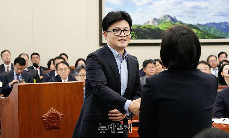 한동훈 국민의힘 대표가 24일 오후 서울 여의도 국회에서 열린 국회 환경노동위원회의 환경부, 기상청에 대한 종합감사에서 인사를 나누고 있다.