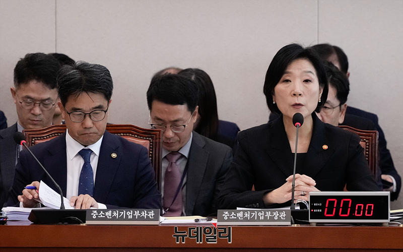 오영주 중소벤처기업부 장관이 25일 오전 서울 여의도 국회에서 열린 국회 산업통상자원중소벤처기업위원회의 중소벤처기업부 등에 대한 종합감사에서 중소벤처기업부, 특허청 등에 대한 종합감사에서 의원들의 질의에 답하고 있다.