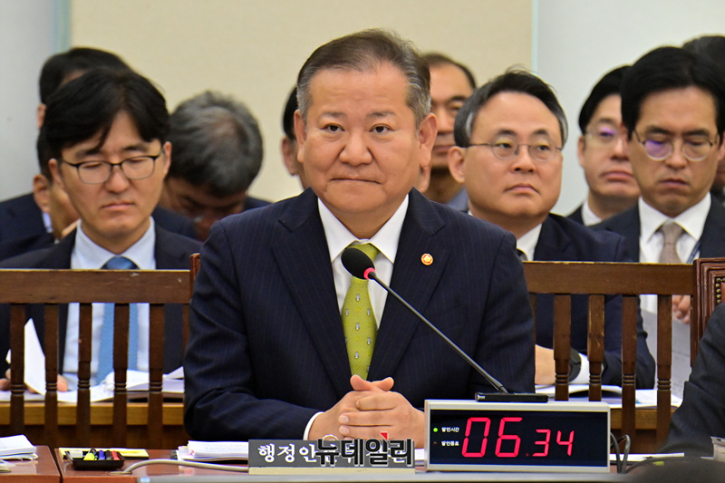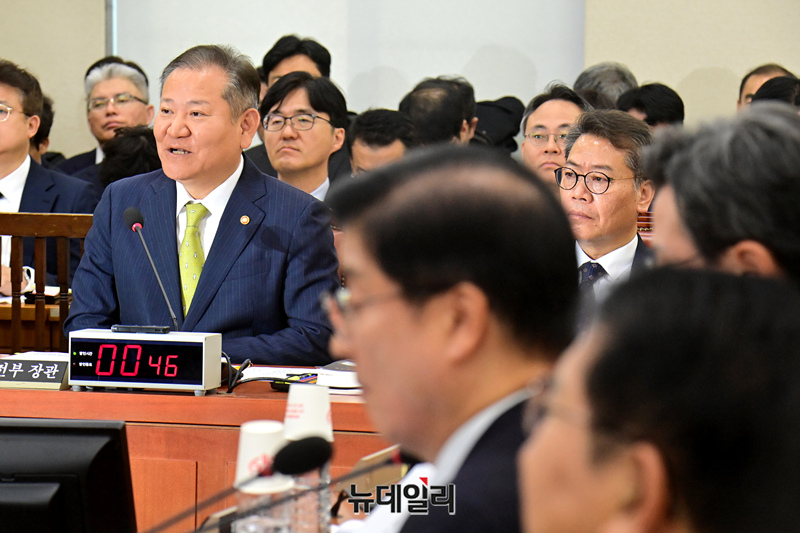 이상민 행정안전부 장관이 25일 오전 국회에서 열린 국회 행정안전위원회 종합국정감사에 의원들의 질문에 답하고 있다.