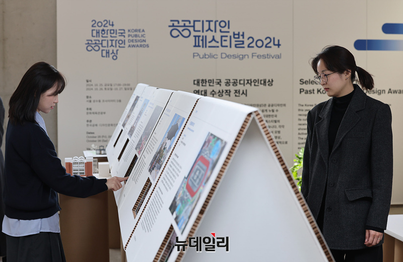 '공공디자인 페스티벌 2024'이 개막한 25일 오후 서울 성동구 성수 코사이어티에서 관람객들이 대한민국 공공디자인대상 역대 수상작 전시를 관람하고 있다.