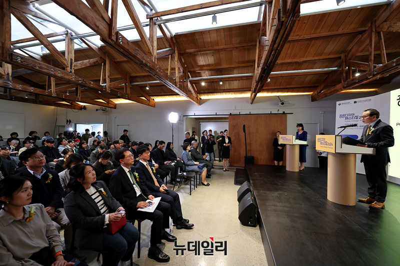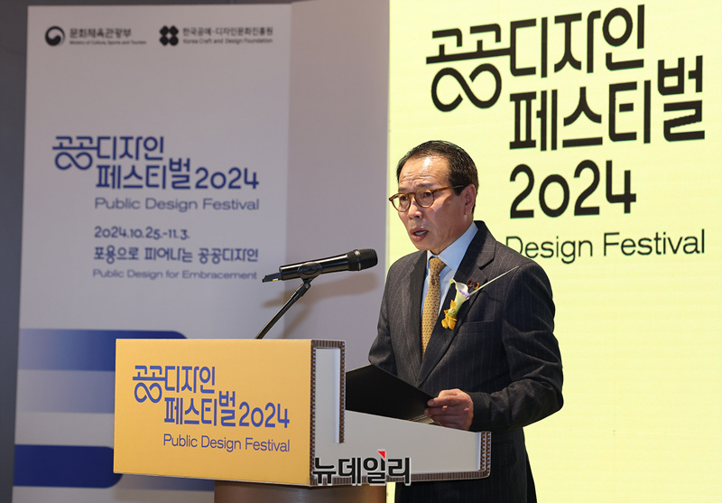 장동광 한국공예·디자인문화진흥원장이 25일 오후 서울 성동구 성수 코사이어티에서 열린 '공공디자인 페스티벌 2024' 개막식에서 축사를 하고 있다.개막식에 이어진 시상식에는 '포용:모두를 위한 변화'를 주제로 우수사례 14점, 아이디어 23점을 선정해 총 12개 수상작에 대한 시상이 진행됐다. 대상인 대통령상은 서울 양천구 목동의 '오목공원 리노베이션'이 수상했다.문화체육관광부는 한국공예·디자인문화진흥원과 함께 10월 25일부터 11월 3일까지 서울, 대전을 중심으로 전국 180여 곳에서 '공공디자인 페스티벌 2024'를 개최한다.