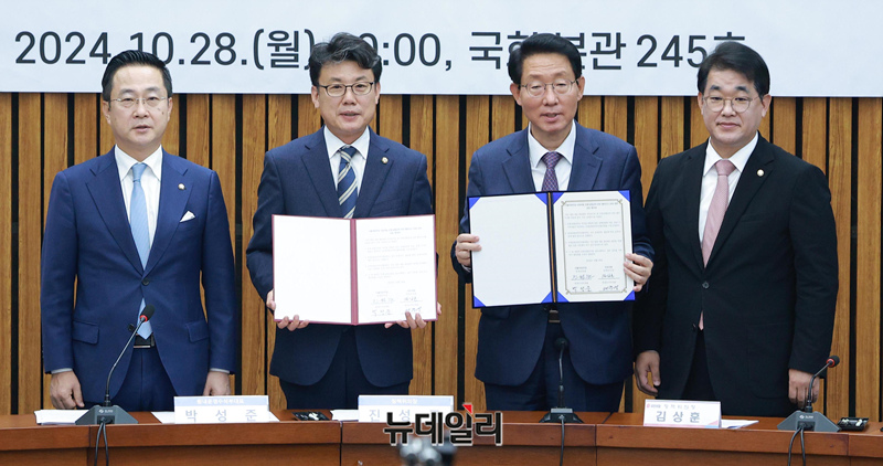 김상훈 국민의힘 정책위의장, 배준영 원내수석부대표, 진성준 더불어민주당 정책위의장, 박성준 원내수석부대표가 28일 국회에서 열린 더불어민주당-국민의힘 민생·공통공약추진협의회 출범식에서 합의문에 서명한 뒤 취재진을 향해 포즈를 취하고 있다.