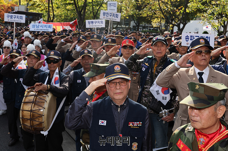 대한민국월남전참전자회 회원들이 28일 오후 서울 종로구 동화면세점 앞에서 열린 북한정권의 러시아 파병을 규탄하는 궐기대회에서 거수경례를 하고 있다.