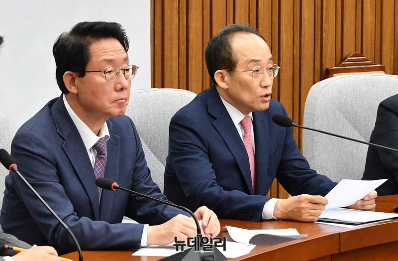 추경호 국민의힘 원내대표가 29일 오전 국회에서 열린 국정감사대책회의에서 모두발언을 하고 있다.