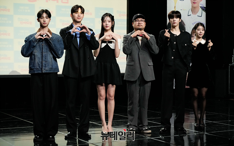 배우 손동표, 최건, 강나언, 김우석, 한채린, 배하늘 감독이 29일 오전 서울 강남구 일지아트홀에서 열린 웹드라마 '0교시는 인싸타임' 제작발표회에서 포즈를 취하고 있다.