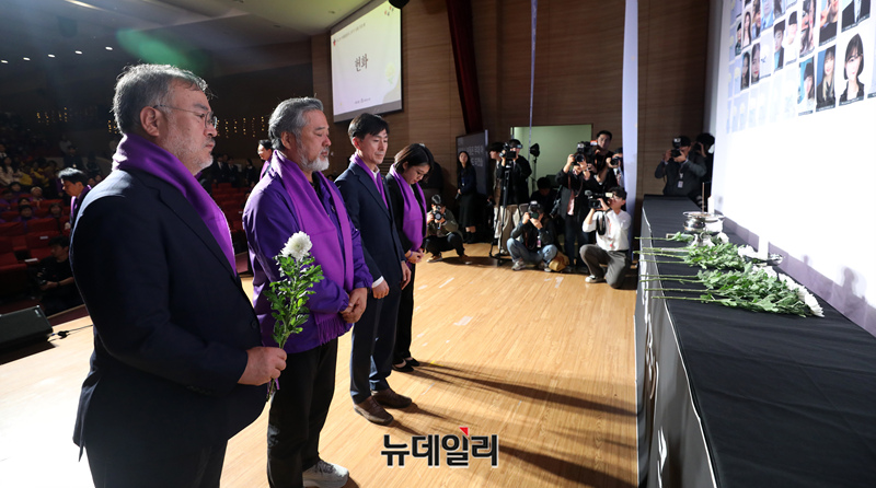 이태원 참사 유가족, 우원식 국회의장 여야 원내대표가 29일 국회에서 열린 10·29 이태원참사 2주기 추모식에서 희생자들의 영정에 헌화하고 있다. (사진=공동취재)