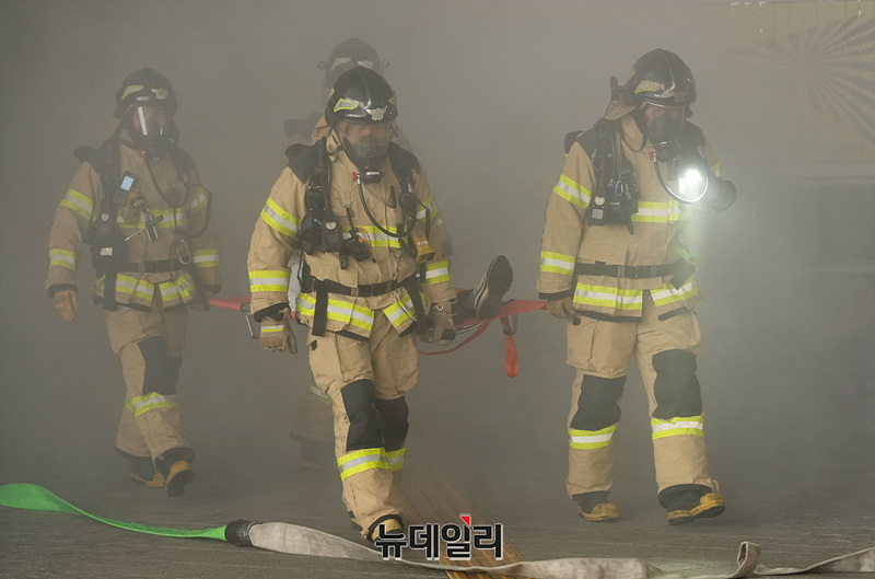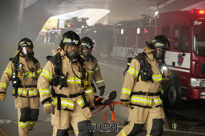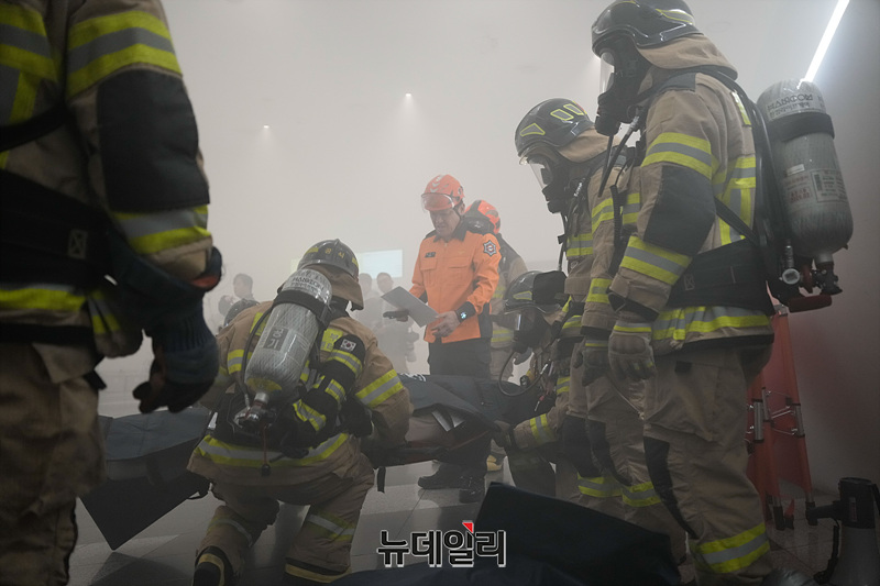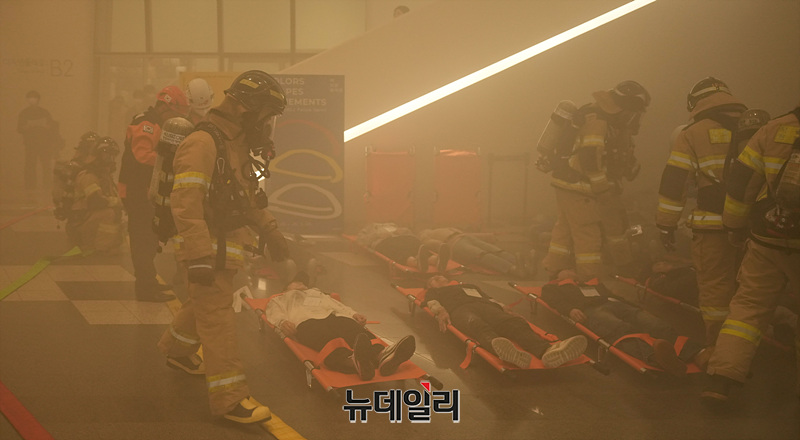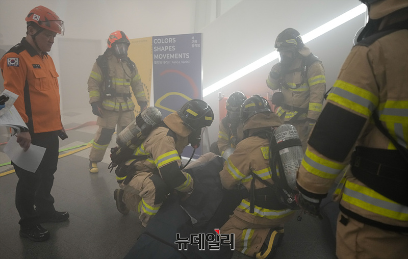 2024 서울시 재난대응 안전한국훈련이 열린 30일 오전 서울 중구 동대문디자인플라자에서 소방관계자들이 다중밀집시설 화재상황 대응 훈련을 하고 있다.