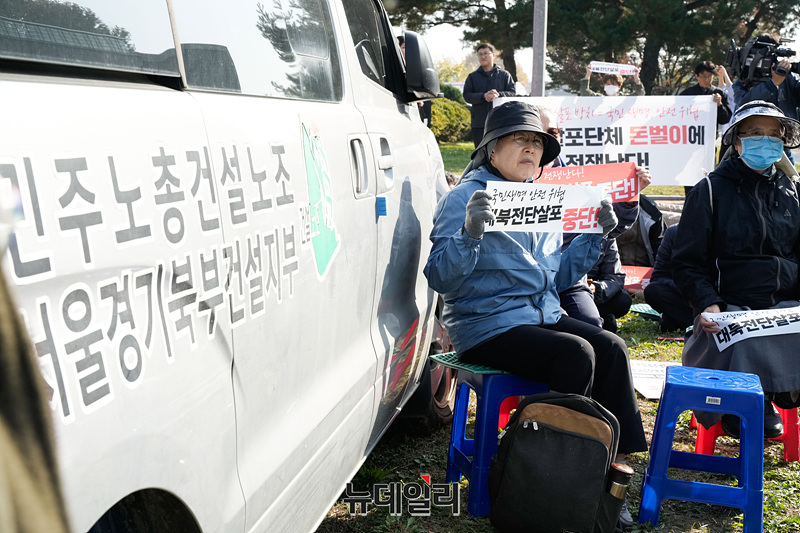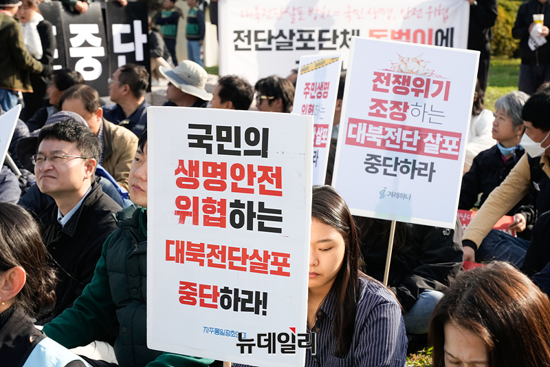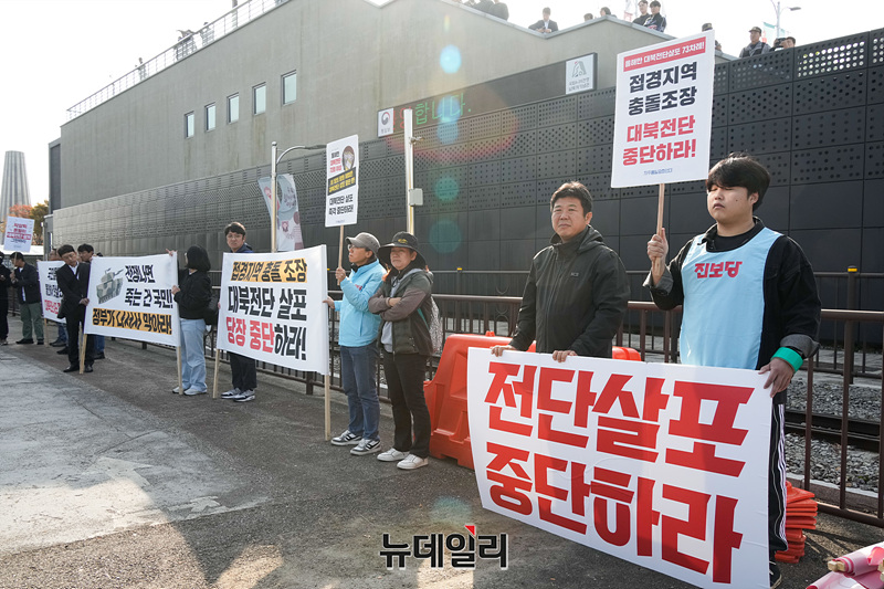 평화위기파주비상행동, 겨레하나, 진보당 관계자들이 31일 오전 경기 파주시 국립 6.25전쟁납북자기념관 앞에서 대북전단 살포를 규탄하고 있다. (경기 파주=서성진 기자)