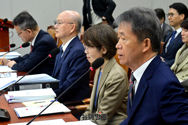 김용원 국가인권위원회 상임위원이 31일 국회에서 열린 국회운영위원회의 국가인권위원회 등 국정감사에서 단체 증인선서를 거부한 후 거부 이유를 설명하고 있다.