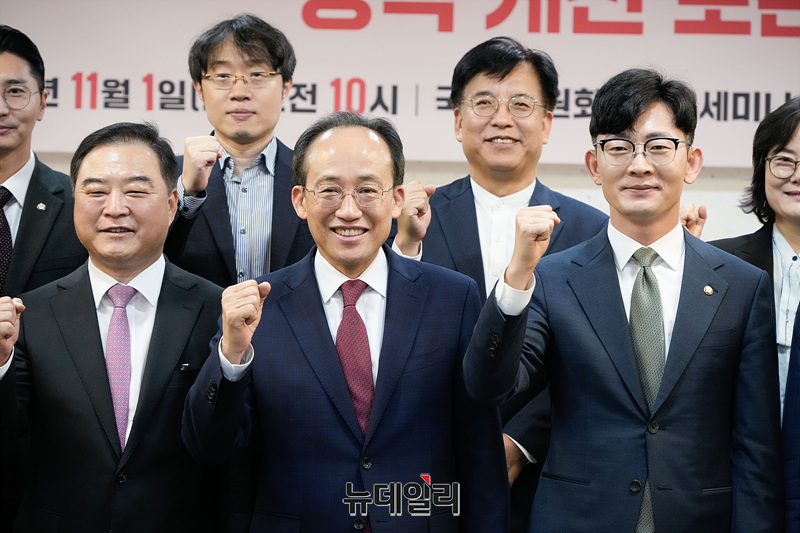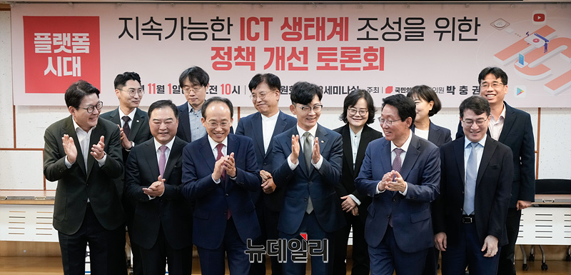 추경호 국민의힘 원내대표, 박충권 의원 등 참석자들이 1일 오전 서울 여의도 국회 의원회관에서 열린 '지속가능한 ICT 생태계 조성을 위한 정책 개선 토론회'에서 기념촬영을 하고 있다.