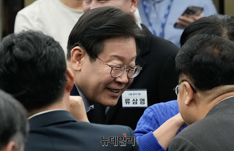 이재명 더불어민주당 대표가 1일 오전 서울 여의도 국회에서 열린 '전국 지역위원장·국회의원 비상 연석회의'에 참석하며 인사를 나누고 있다.