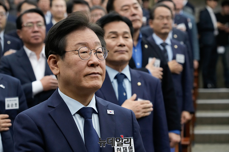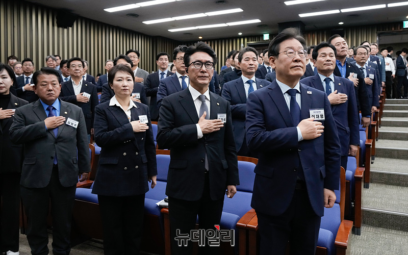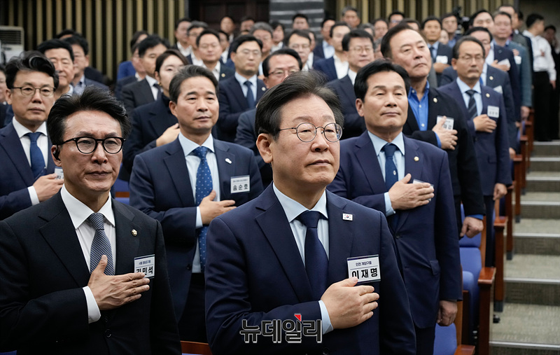 이재명 더불어민주당 대표를 비롯한 참석자들이 1일 오전 서울 여의도 국회에서 열린 '전국 지역위원장·국회의원 비상 연석회의'에서 국민의레를 하고 있다.