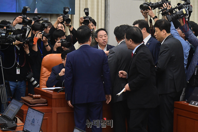 배준영 국민의힘 원내수석부대표 및 여야 의원들이 1일 국회 운영위원회에서 열린 대통령비서실, 국가안보실, 대통령경호처에 대한 종합 국정감사에서 회의 운영과 관련해 항의하고 있다.