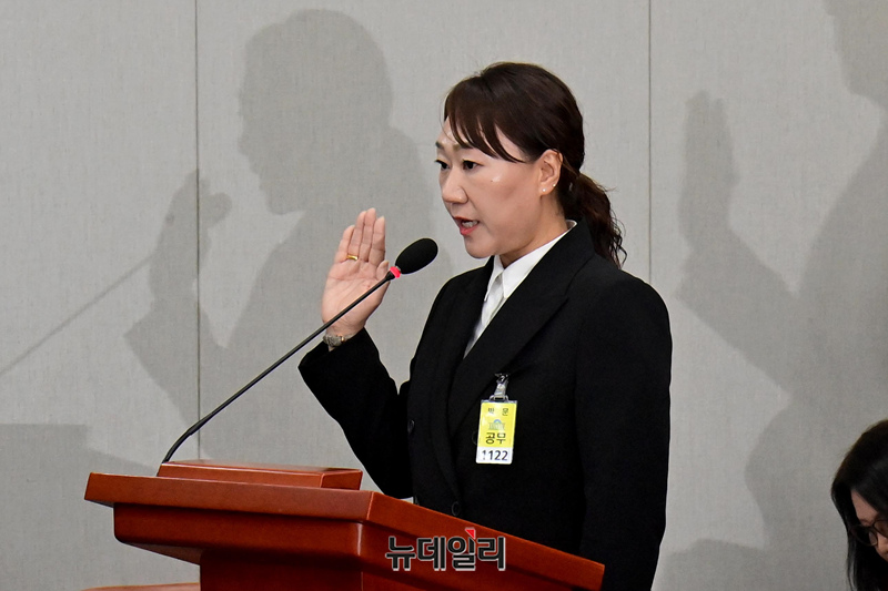 김건희 여사의 공천개입 의혹을 제기한 강혜경씨가 1일 오후 국회 운영위원회에서 열린 대통령비서실·국가안보실·대통령 경호처 대상 종합 국정감사에 증인 선서를 하고 있다.