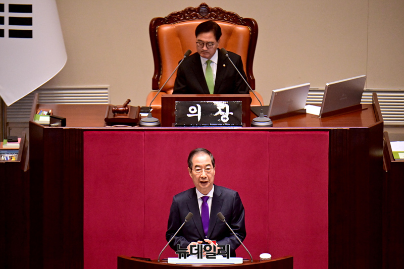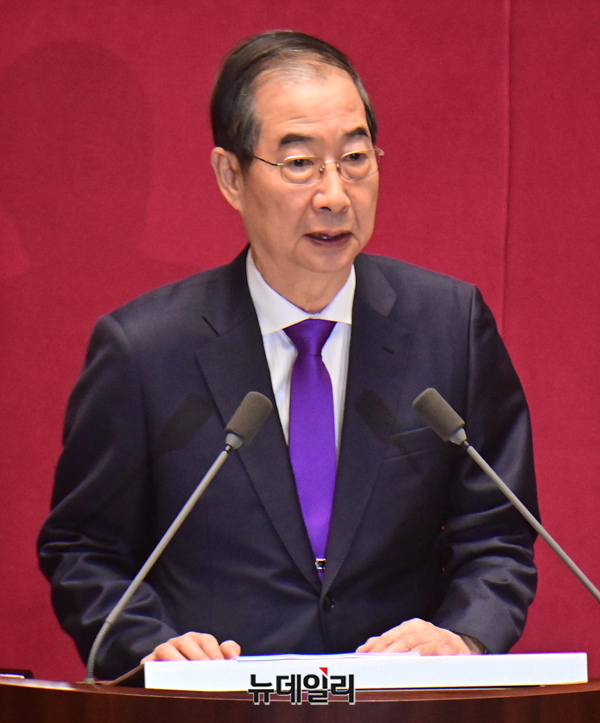 한덕수 국무총리가 4일 오전 국회에서 열린 본회의에서 2025년도 예산안 및 기금운용계획안에 대한 시정연설을 하고 있다.