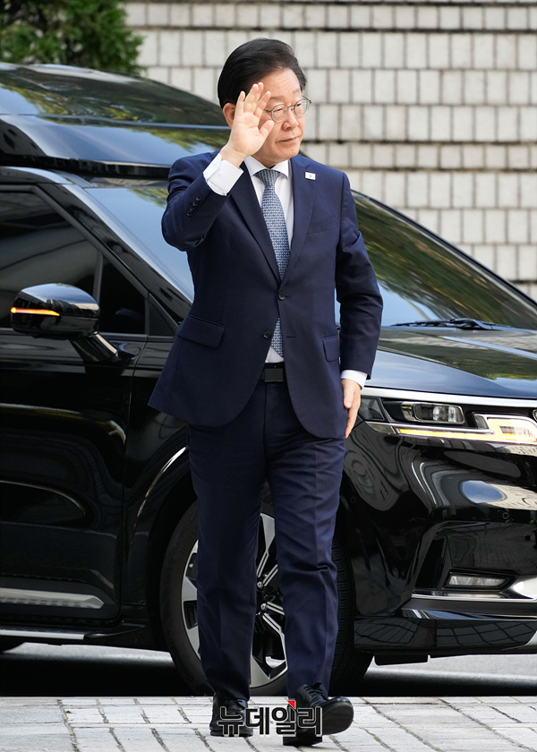 이재명 더불어민주당 대표가 5일 오전 서울 서초구 서울중앙지방법원에서 열린 '대장동 배임·성남FC 뇌물' 관련 공판에 출석하며 지지자들에게 인사하고 있다.