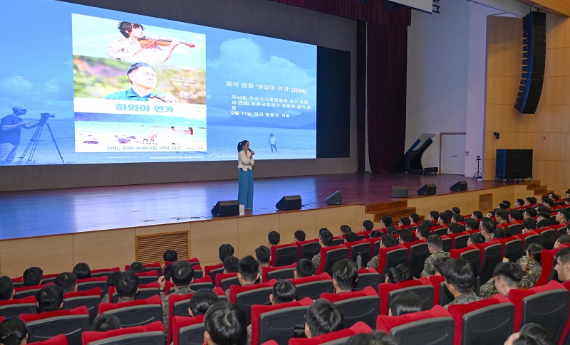 영화 '하와이 연가'의 한 장면에서는 하와이 호놀룰루항에 입항한 대한민국 해군의 '마라도함' 선내에서 아름다운 음악이 흐른다. 이 장면으로 해군과 남다른 인연을 맺은 '하와이 연가'의 이진영 감독은 지난 6월 해군사관학교 생도 600명을 대상으로 특강을 펼쳤다.