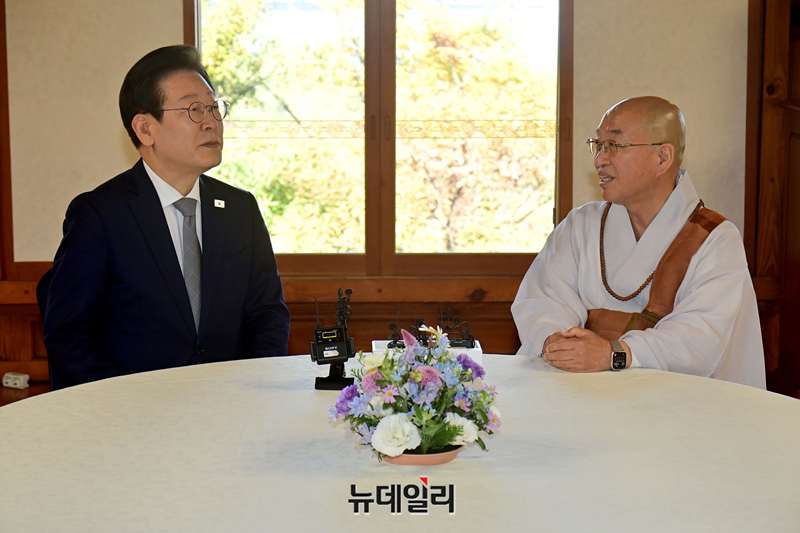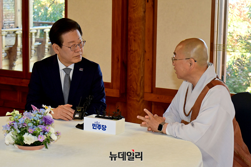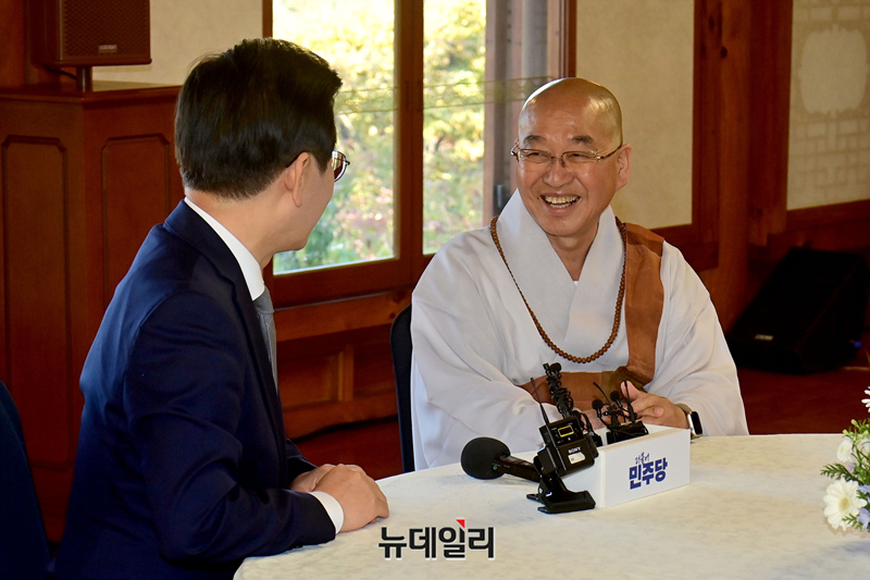 이재명 더불어민주당 대표와 법륜스님이 6일 오후 국회 사랑재에서 차담회를 갖고 있다.