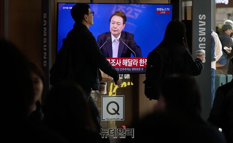 윤석열 대통령이 대국민담화 및 기자회견을 진행한 7일 오전 서울역 대합실을 찾은 시민들이 TV 중계를 지켜보고 있다.